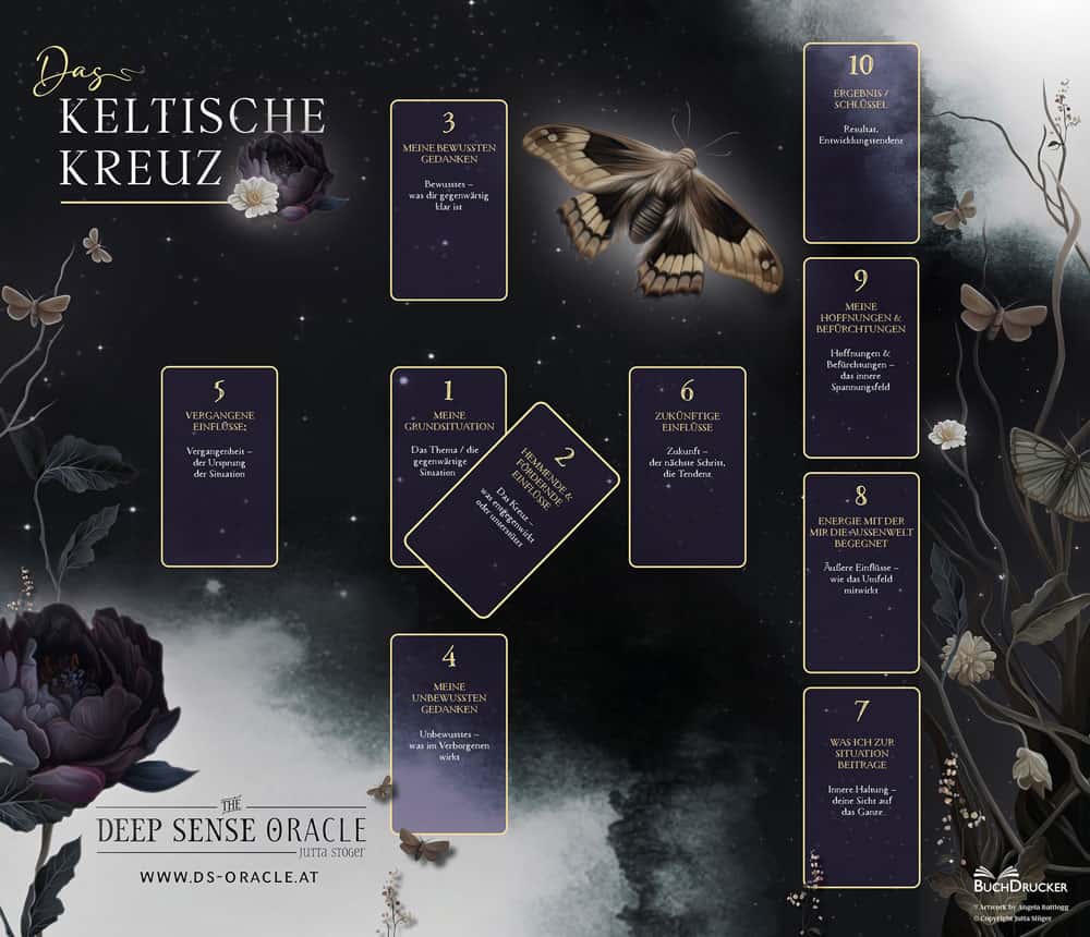 - Klassisches 10-Positionen-System des Keltischen Kreuzes – deutlich beschriftet und intuitiv angeordnet