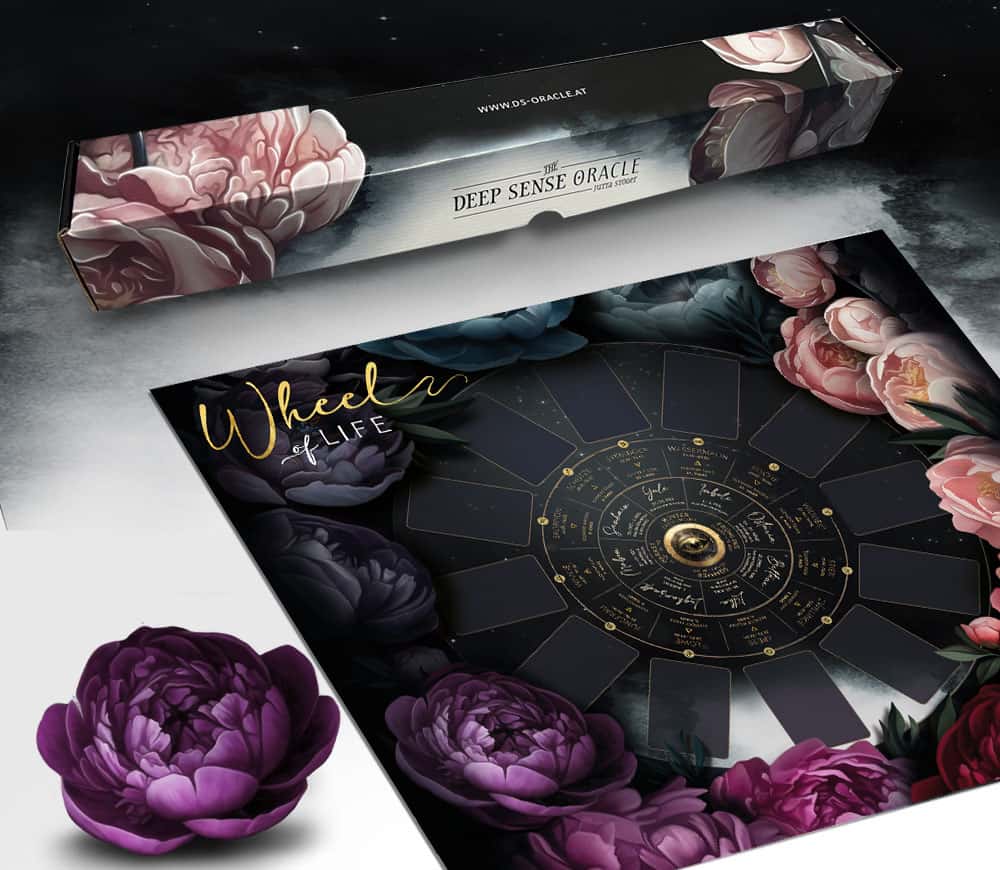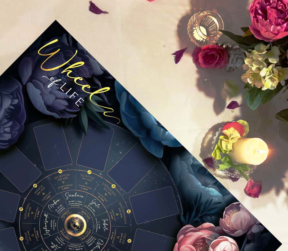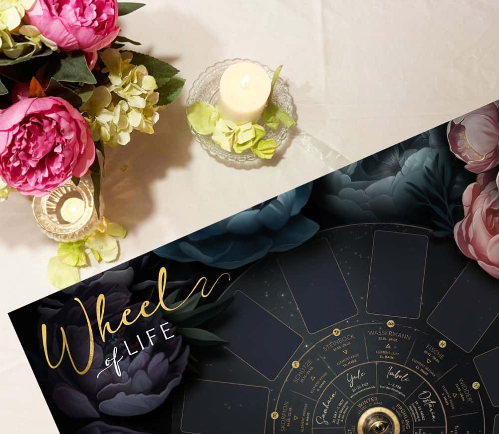 Das Wheel of Life ist eine Legeschablone für den Blick auf das große Ganze – ein magisches Deutungsrad, das den Rhythmus des Lebens sichtbar macht. Es verbindet die Symbolik der Jahreskreise mit den zwölf Tierkreiszeichen und lädt dazu ein, die zyklische Bewegung von Werden, Wachsen, Wandeln und Ruhen intuitiv zu erfassen.